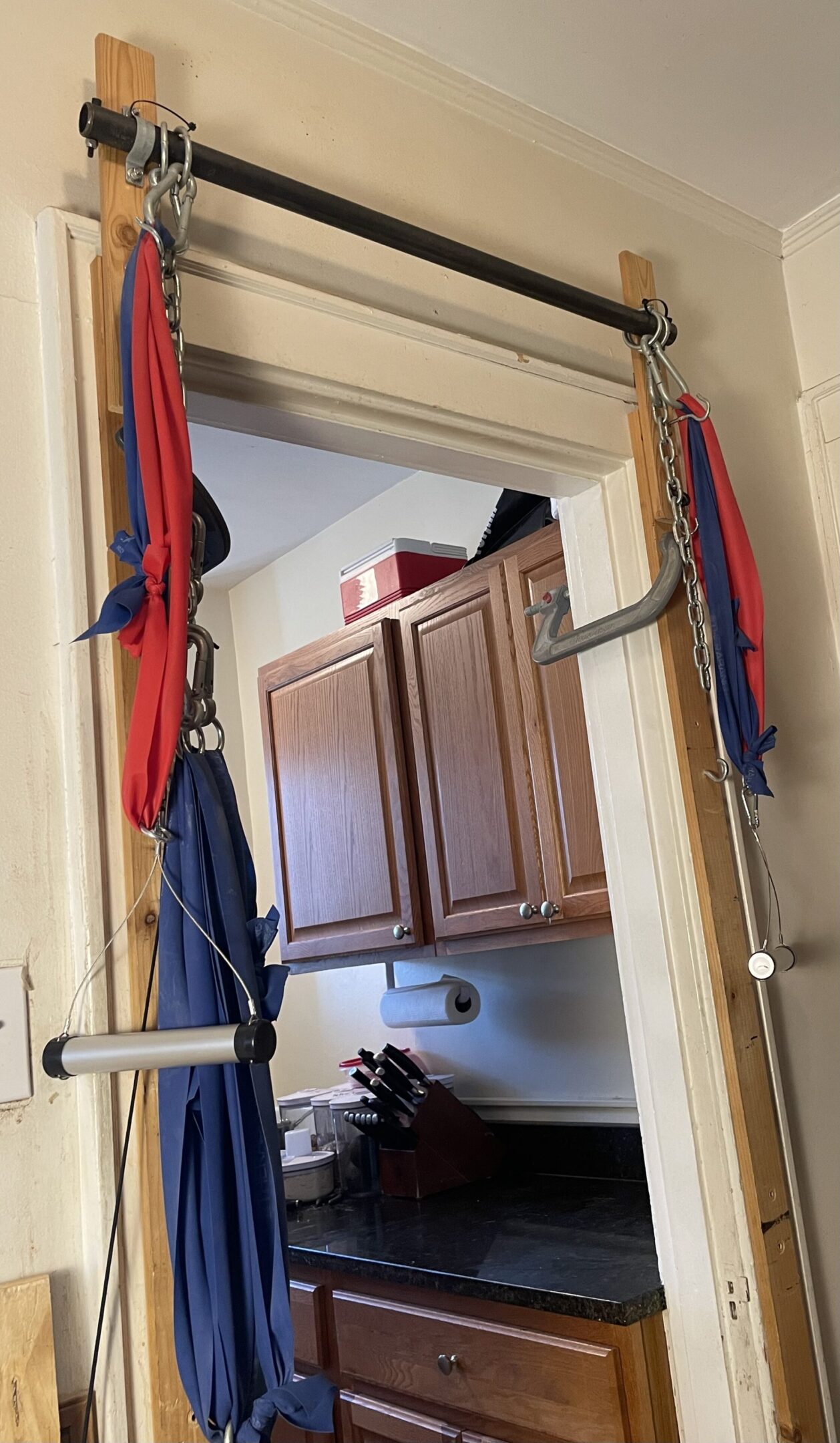 This unit will work on any door frame without the door, like on a closet, or an open doorway. Almost no floor space required, so it is ideal for apartments and homes. Quick and easy rotation between exercises. Easily add or subtract exercise bands. Ideal for quick, daily routine, or computer break for all teens and older.